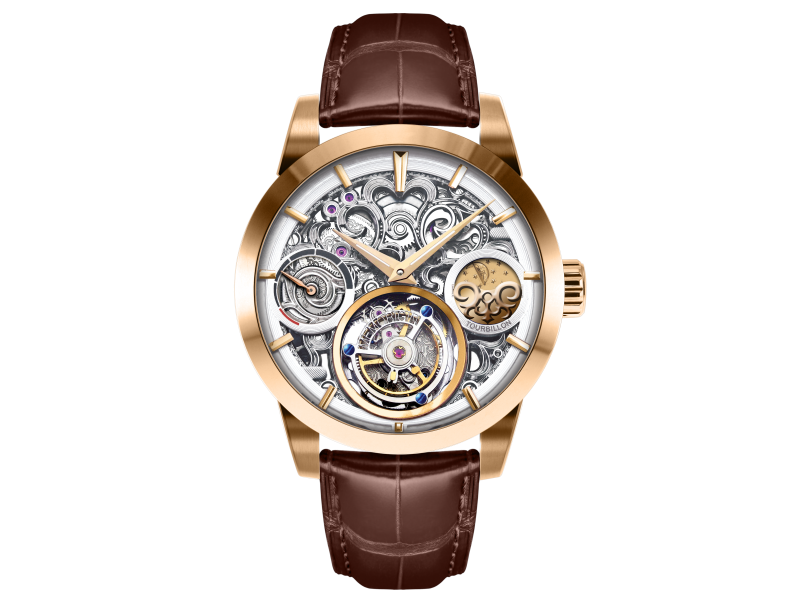 型號:MO1006 機芯直徑:33毫米 最小厚度:6.45 毫米 193件組件及27顆寶石承軸 振頻: 28800次/每小時 6時位陀飛輪每轉一圈60秒 飛行陀飛輪 雙發條動力驅動 80小時動力儲存 能量顯示 星辰盤功能 擺輪及擒縱機構同時圍繞擺輪中心 鱷魚皮表帶 藍寶石玻璃