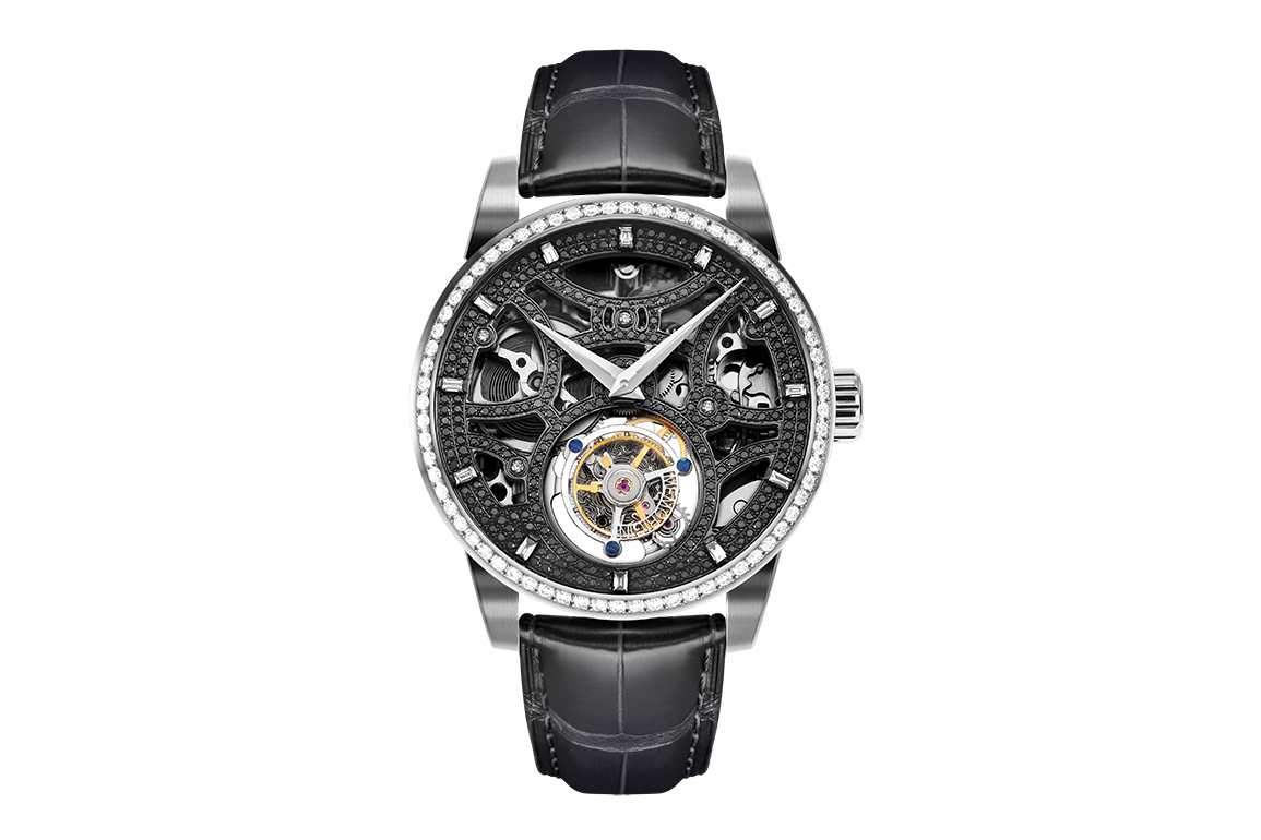 手表型號:ST 0821 白鑽 98粒,約重1.09克拉 黑鑽 273粒, 約重1.11克拉 155件組件及18顆寶石承軸 振頻:28800次/每小時 6時位陀飛輪每轉一圈60秒 擺輪及擒縱機構同時圍繞擺輪中心 飛行陀飛輪 40小時動力儲存 鱷魚皮表帶 藍寶石玻璃 條碼 : 4894379222684
